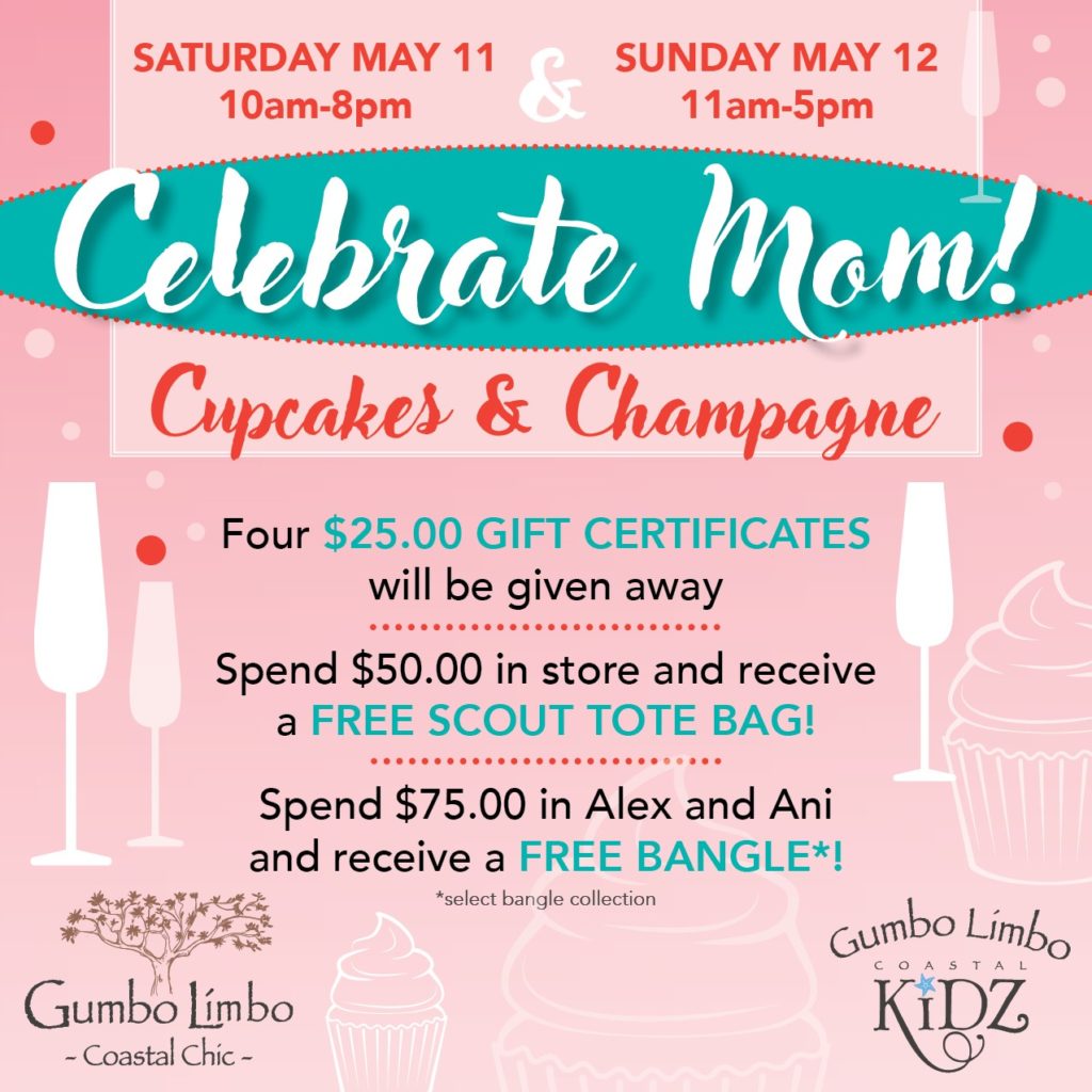 Does your mom need a little retail therapy? Take her to Gumbo Limbo in Stuart, Florida for an afternoon full of free gift certificates, free tote bags, free Alex & Ani bracelets and, of course, cupcakes and champagne! Gumbo Limbo will be spoiling moms from 10am-8pm on Saturday, May 11 and 11am-5pm on Sunday, May 12.