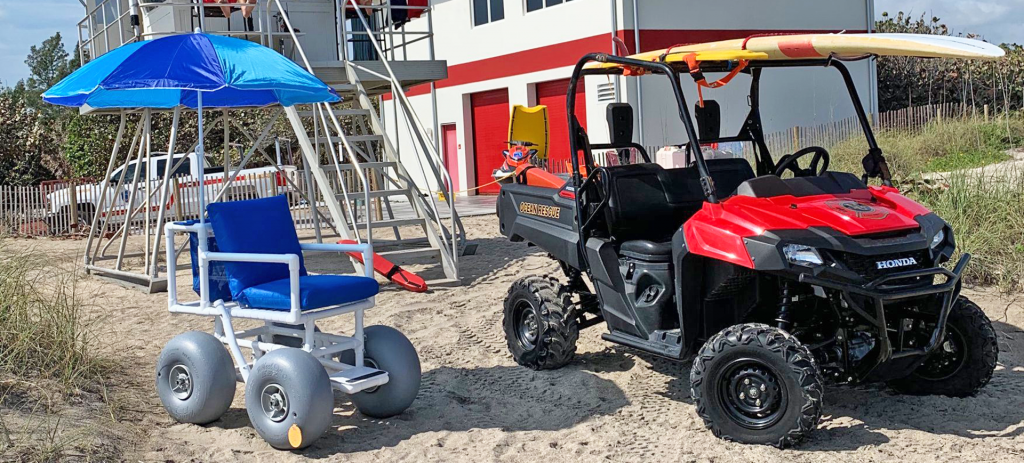Lifeguards will assist residents and visitors, simply request one from the guard tower. The chairs are lightweight — made of polyvinyl chloride, or PVC — and feature four air-filled balloon tires, making them easy to navigate through sand. And for the convenience of a day at the beach, each chair has its own umbrella and a pouch attached to the back, big enough to haul your favorite beach essentials.
