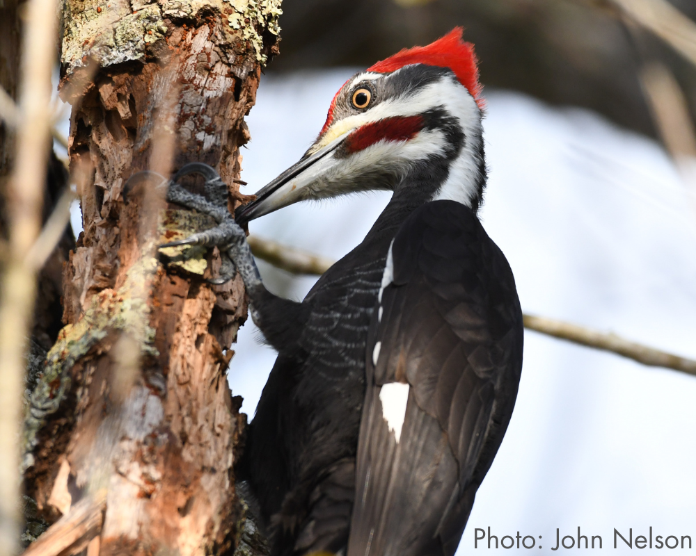 Their distinctive and prehistoric call matches the striking red flaming crest on their heads. These flashy and impressive birds were once threatened due to deforestation but have gradually increased in numbers since the early 1900’s. They are large, growing to 17” and are a delight to see year-round gracefully cruising amongst the trees or on a tree excavating their charismatic rectangle hole.