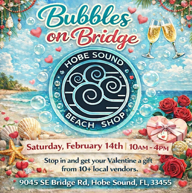 Welcome to Hobe Sound Beach Shop Presents Bubbles on Bridge! Join us at Hobe Sound Beach Shop on February 14, 2026 from 10am – 4 pm.