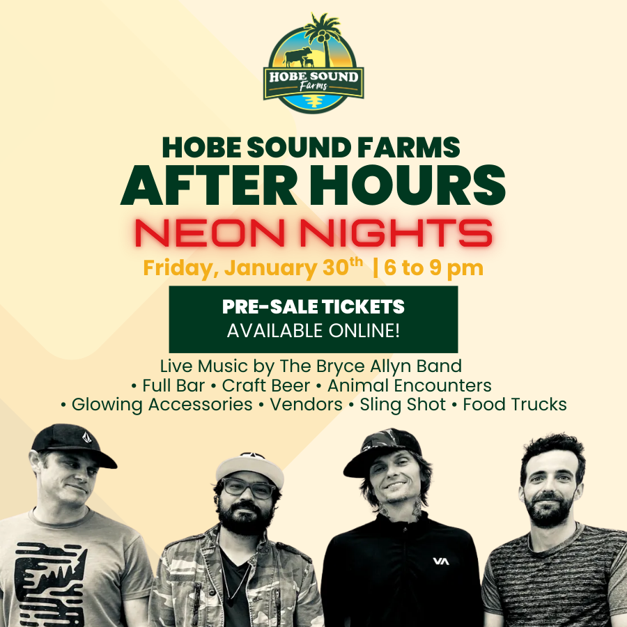 Experience Hobe Sound Farms After Hours: Neon Nights—a lively night on the farm featuring live music from The Bryce Allyn Band, Glow-in-the-Dark sling shot at the Bouquet Bunker, food trucks, animal encounters, and nighttime hayride tours around the farm. Sip on local craft beer or cocktails from our full bar!