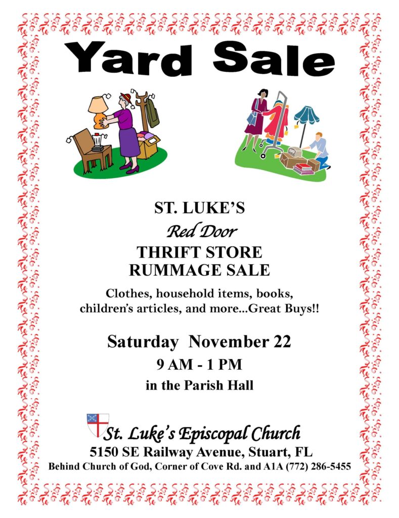 The Red Door Thrift Shop of St. Luke's Episcopal Church, 5150 SE Railway Ave., Cove Road at Dixie Highway, Stuart will have a Yard Sale on Saturday, Nov. 22 from 9 a.m. to 1 p.m., in the parish hall. The thrift shop itself is normally open Wednesdays through Saturdays, from 10 a.m. to 1 p.m....