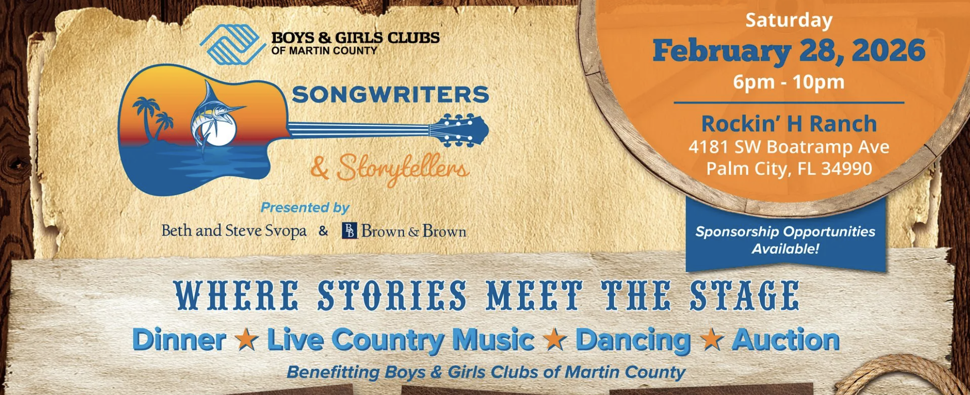 The third year of Songwriters & Storytellers promises to be an unforgettable evening of music, storytelling, and community, all in support of Boys & Girls Clubs of Martin County. This unique event brings together some of the most talented songwriters from Nashville and beyond, sharing the stories behind their chart-topping hits in an intimate and captivating setting. Guests will enjoy a night of soulful performances, heartfelt connections, and the chance to make a lasting impact on the lives of local youth. We have an incredible line up with an opening act for cocktail hour, the songwriters round and finish the night out with dancing with one of our local favorite bands.