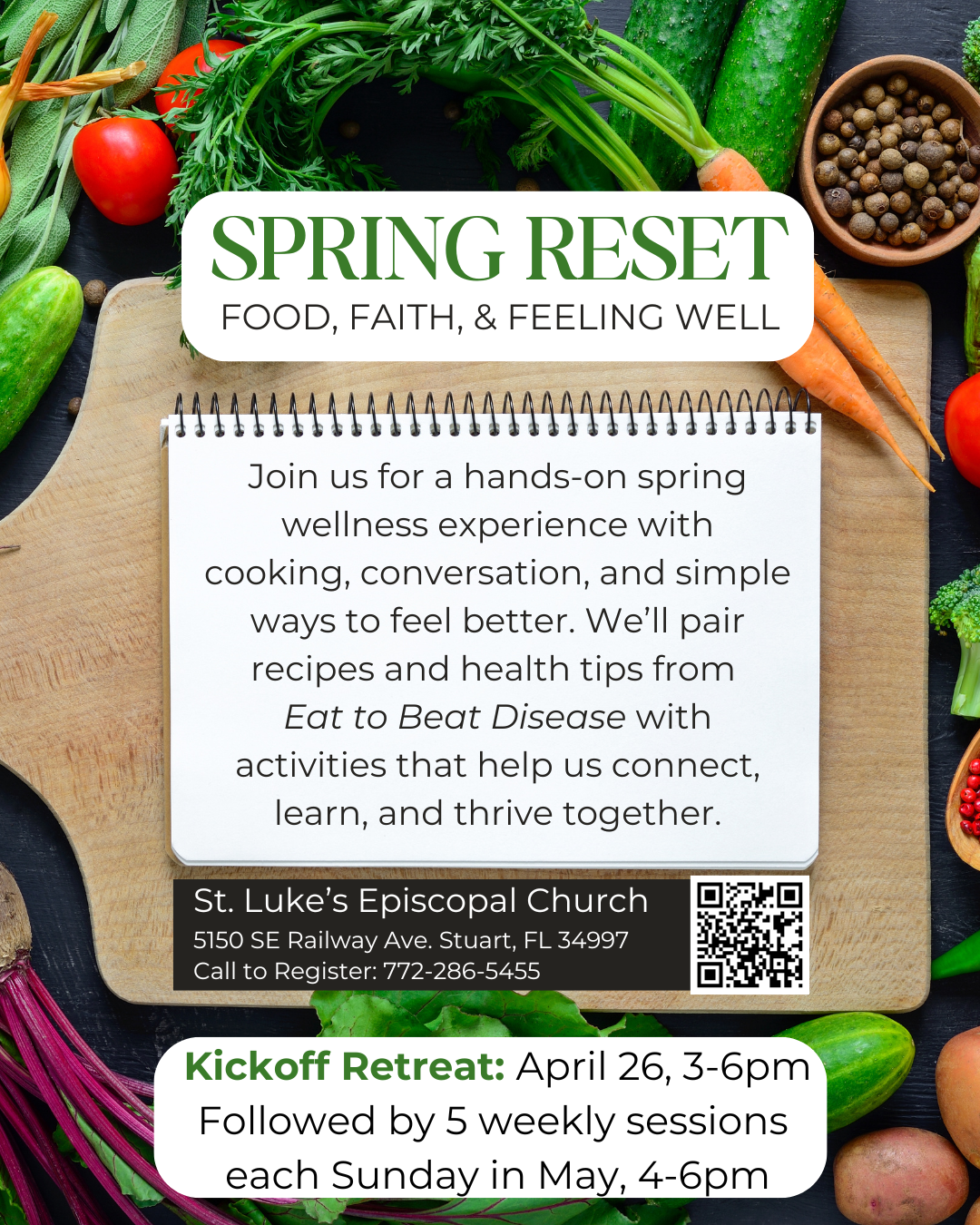 St. Luke’s Episcopal Church, 5150 SE Railway Ave., Cove Road at Dixie Highway, Stuart, will host “Spring Reset: Food, Faith, & Feeling Well” in the parish hall.
