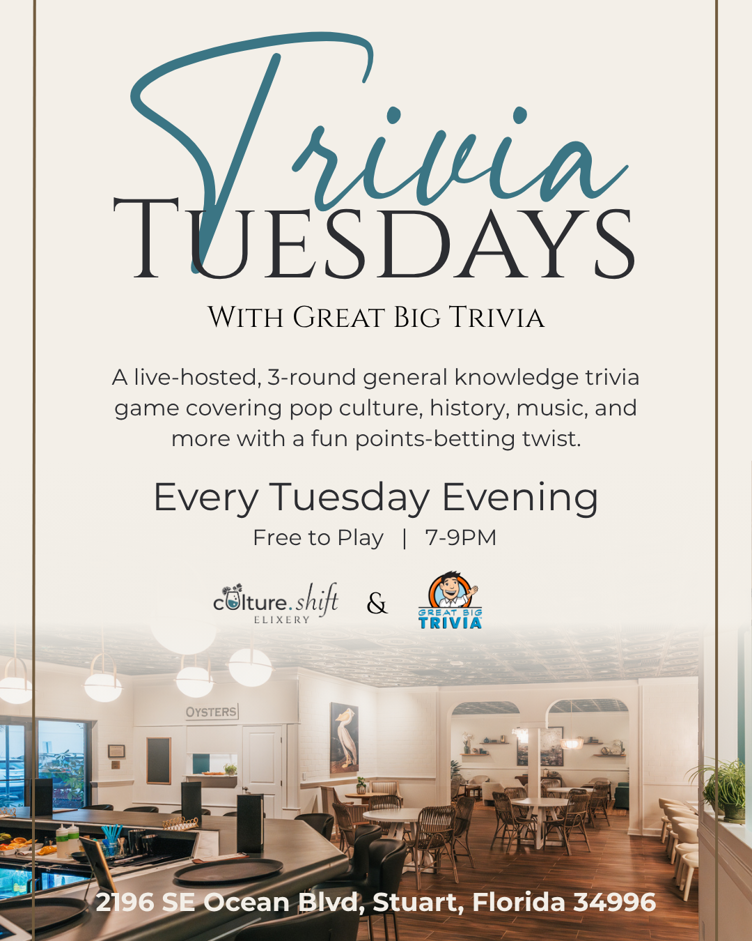 Every Tuesday evening from 7-9PM, Great Big Trivia is hosting a live trivia night here at Culture Shift Elixery!