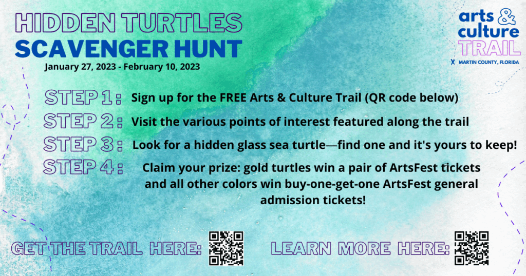 Continuing our partnership with MartinArts and Palm City-based glass artist Dot Galfond of License to Kiln, this year’s scavenger hunt will officially begin on Friday, January 27 and conclude on Friday, February 10. You’ll have two weeks to hit the Martin County Arts & Culture Trail and find your hidden treasure leading up to ArtsFest 2023 (taking place February 11th and 12th in Gazebo Park).
