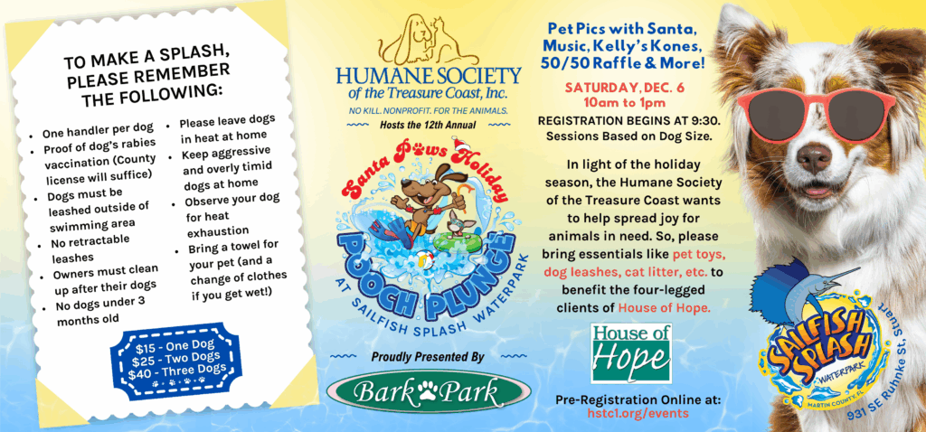 Santa Paws Holiday Pooch Plunge Date: Saturday, Dec. 6 Time: 10 a.m.–1 p.m. Location: Sailfish Splash Waterpark, 931 SE Ruhnke St, Stuart Details:The Pooch Plunge, presented by The Bark Park, is a festive event that invites dogs to enjoy an open swim before the Sailfish Splash Waterpark closes for winter, with proceeds benefiting homeless animals...